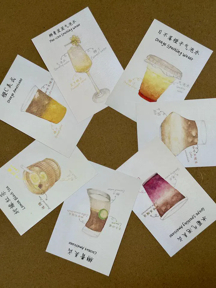 This is a set of postcards that I personally designed and hand-illustrated. The front side features signature drinks from my coffee shop, while the back highlights iconic landmarks from my hometown, Chongqing.
